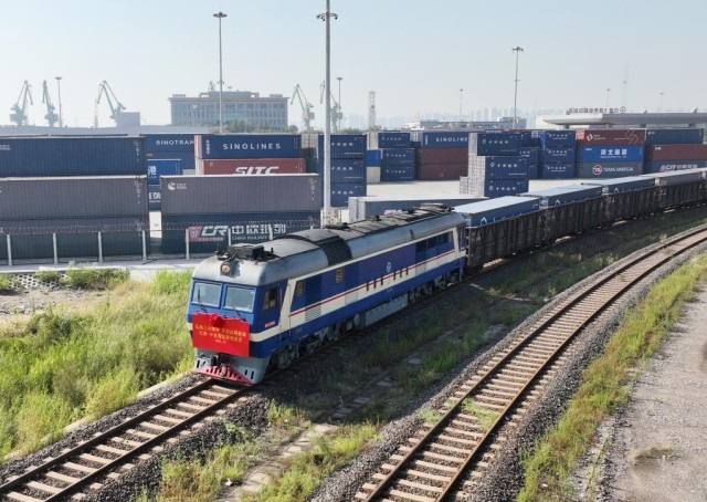 2025年10月13日拍摄的天津-中亚图定班列首发现场(无人机照片)。新华社记者 李然 摄