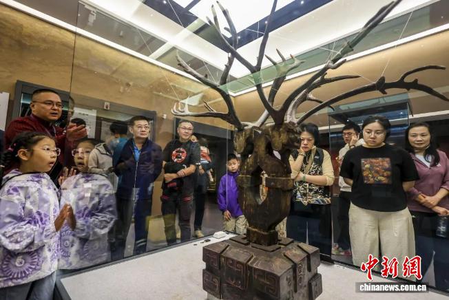 游客在荆州博物馆参观战国时期楚墓出土的木雕镇墓兽。(资料图)张梦瑶 摄
